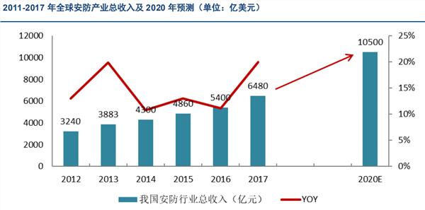 根据中安网统计,2017 年国内安防市场规模达到 6480 亿元,行业增速为 14.8%;另外,根据中安协发布的《中国安防行业“十三五”(2016-2020 年)发展规划》指出,到 2020 年安防企业总收入达到 8000 亿元左右,年增长率达到 10%以上,实现行业增加值 2500亿元,2020 年预计行业总规模超过 1 万亿元,年均复合增速17.5%。